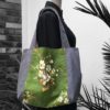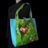 Très grand sac cabas XXL, doublé réversible, pour femme. Tissu d’ameublement au dessin de marguerites sur fond bleu profond, fleurs en blanc jaune vert. Une toile impression main signée Sunbeam – Sunfast and washable – handprinted (années 1960s). Bordé au recto et au verso (doublure) d’une toile coton à fines rayures bleues, éditeur QjuTie Kids Collection.