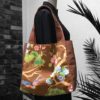 Grand sac cabas XL, doublé réversible, recto toile vintage 1960s-1970s en coton texturé (barkcloth) imprimé de fleurs dans les tons d’automne, orangé, brun, vert, blanc sur fond noir. Bordée au recto d’une toile unie brun argile.