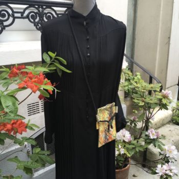 Elle est terminée par deux petits capuchons en plastique CCB de couleur gris noir, et reliée par un bouton vintage art déco 1930s en plastique moulé vert.