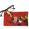 Pochette doublée toile vintage 1940-1950s Agathe Beldecor fleurs mauve blanc orange fond rouge coupon ancien rare avec bouton vintage.
