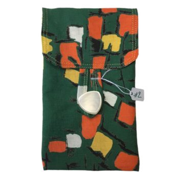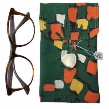 Pochette étui à lunettes en toile vintage 1950s à imprimé géométrique motifs carrés blanc jaune orange cerclés noir sur fond vert mousse.