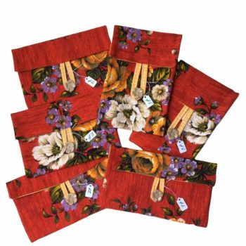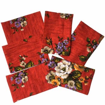 Coupon vintage d’un beau rouge profond et lumineux, imprimé fleuri dans les tons mauves, blancs, beiges et oranges, feuillages verts – Agathe, création Beldecor, garanti air lumière lavable. Doublure coton à carreaux tissés jaune orangé (jaune dahlia).