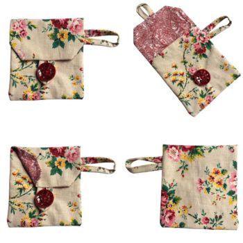Pochettes réalisées dans une toile d’ameublement vintage typique des années 1950s 1960s, imprimé de branchages de petites fleurs en rose, rouge rubis, blanc et jaune or, et feuillage vert sur fond écru / ivoire.