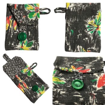 Petite pochette boutonnée en toile d’ameublement vintage typique des années 1950s, en coton texturé (barkcloth), imprimé de fleurs stylisées en rouge, vert, jaune et blanc sur fond noir. Un tissu signé O.A.L Paris, une entreprise du textile fondée en 1945. Au verso doublure 100% coton à motifs floraux, petites fleurs de style liberty dessinées en blanc sur fond noir. Fermeture avec bride en tissu et bouton ancien 1960s ou 1970s en plastique moulé vert.
