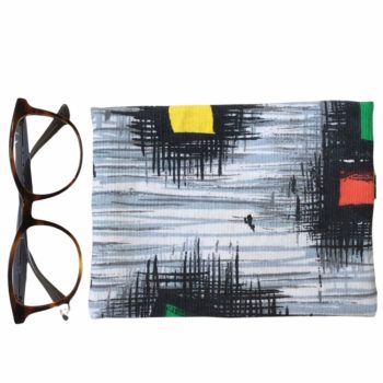 Coupon vintage ancien rideau des années 1950s 1960s, toile d’ameublement garantie air lumière, lavable, motif signé Los Angeles. Imprimé graphique, motifs géométriques abstraits époque moderne atomique milieu XXe siècle, dessins noir jaune vert rouge sur fond blanc et bleu donnant une impression de gris clair.