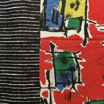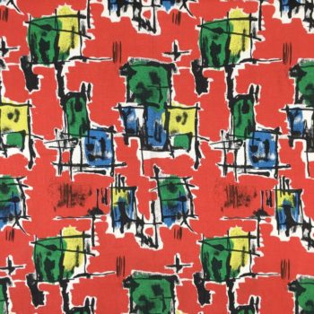 Le motif déploie un graphisme de formes libres, avec des éléments géométriques abstraits emblématiques de l’esthétique moderne atomique du milieu du XXe siècle. Les couleurs vives – bleu, vert, jaune et blanc –, cerclées de noir, contrastent élégamment avec un fond rouge audacieux. Ce tissu ancien français est représentatif de la qualité et de l’originalité dans le design textile de cette époque.