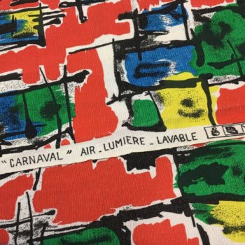 Ce tissu ancien français porte la signature Carnaval. Le dessin expose des formes en bleu, vert, jaune et blanc, cerclées de noir sur fond rouge.