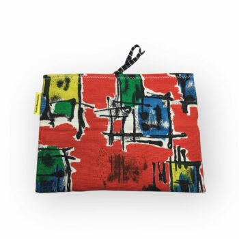 Au recto, la pochette est réalisée dans une toile d’ameublement vintage typique de la fin des années 1950s, en coton. L’imprimé déploie des formes libres, graphiques, aux motifs géométriques abstraits caractéristiques de l’époque moderne atomique du milieu du XXe siècle. Le tissu, en coton épais, présente une texture de fines rainures horizontales de type ottoman.