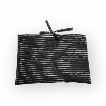 Au verso, vous avez en doublure une popeline de coton imprimée de rayures horizontales irrégulières en blanc sur fond noir – tissu de la marque Qjutie certifié Oeko-Tex Standard 100.