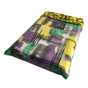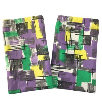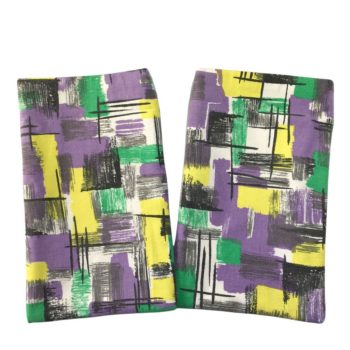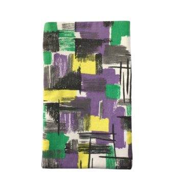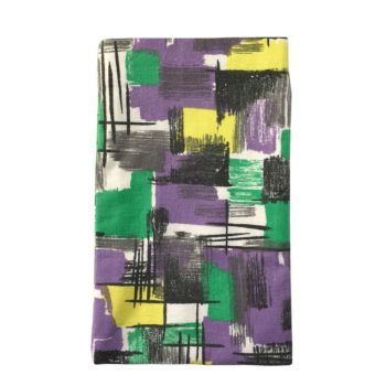 Au recto toile d’ameublement vintage typique des années fin 1950s début 1960s, imprimé de formes libres, motif abstrait multicolore en mauve, vert, jaune et blanc hachuré de traits noirs et gris.