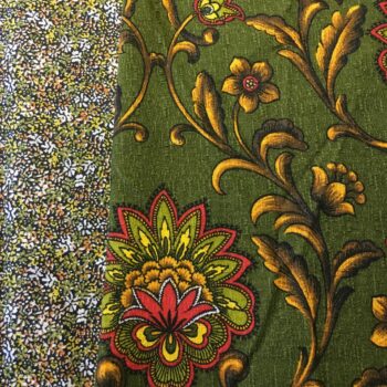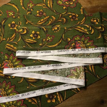 Création réalisée à partir d’une toile d’ameublement vintage en coton texturé (barkcloth). Un imprimé d’ornements baroques, dans le style de damas, aux motifs orientaux damassés en ocre jaune, brun, jaune vif, rouge et vert clair sur fond vert foncé.