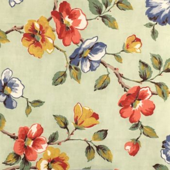 Au recto tissu vintage de la fin des années 1940s. Imprimé de fleurs bleues, jaunes et rouges sur fond vert amande. Coupon vintage neuf, dead stock fabrication française (Auvergne). Au verso (doublure) coton tissage jacquard, motifs carreaux et rayures en vert amande souligné de bleu.