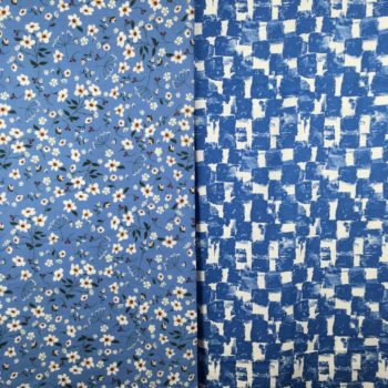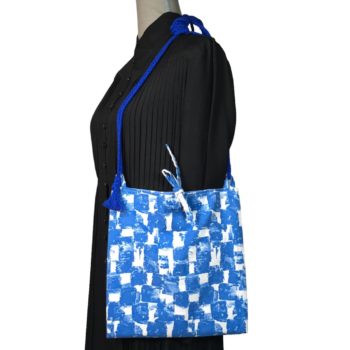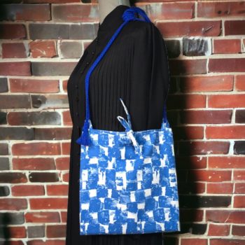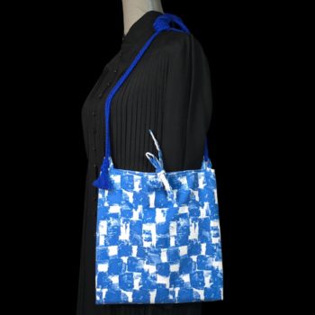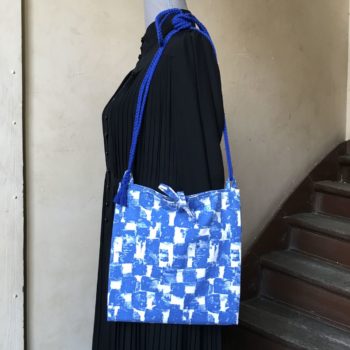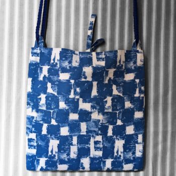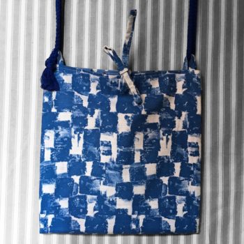 Au recto le sac présente un coupon vintage en coton texturé assez fin, à motifs abstraits en bleu et blanc. C’est un quadrillage irrégulier dessiné avec matière, de type formes libres. Coupon neuf, dead stock, invendus fond de boutique.