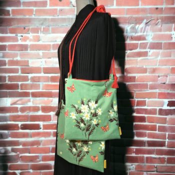 Fait main en France, création originale. Sacoche lavable en toile. Sac zéro déchet. Bagage souple chic stylé. Léger solide pliable durable. Idée cadeau femme. Inspiration rétro, vintage. Tissu d’ameublement upcyclé, surcyclé, revalorisé. Eco-responsable réutilisable.