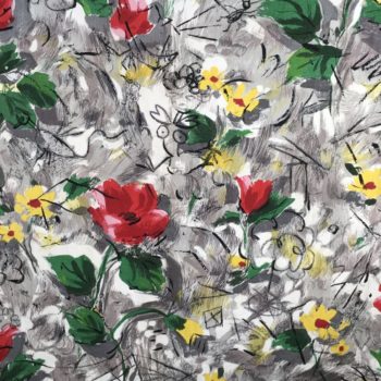Au recto tissu vintage ayant l’aspect d’une véritable toile d’artiste, peinte et dessinée à la main, au toucher glacé. La lisière donnant pour seule indication « Grand Teint – Paris », le coupon est vraisemblablement à dater années 1940s début 1950s. Dessin réalisé à grand traits noirs esquissant des oiseaux, des personnages, une femme-oiseau (harpie ?), des insectes, une toile d’araignée, un verre de vin, sur fond abstrait en nuances de gris et touches de rouge, rose, jaune et vert représentant des fleurs.