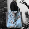 Le motif est présent sur les faces A et B du sac (photos : face A, face B, doublure, poche). Les anses sont réalisées dans les mêmes toiles que le sac.