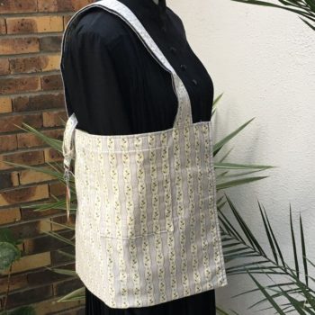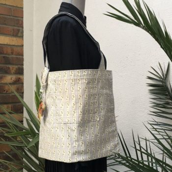 Le motif est présent en miroir sur les faces A et B du sac (photos : face A, face B, détails, doublure / poche). Les anses sont réalisées dans les mêmes toiles que le sac.
