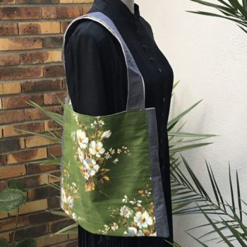 Le sac présente au recto une toile d’ameublement vintage en coton. Le dessin est une composition florale, de branches fleuries, de fleurs en blanc, gris bleu, brun sur fond vert.