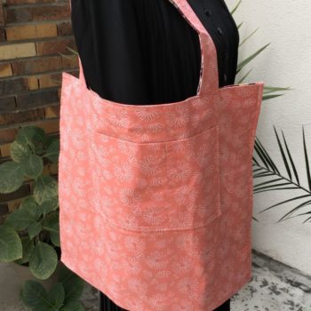 Au verso doublure de coton de la maison Clothworks (basée à Seattle, Etat de Washington). Un dessin de marguerites stylisées sur fond saumon orangé – White Daisies On Coral – signé Gerbera Red par Karen Roti.