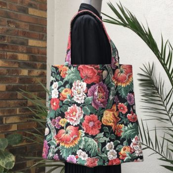 Le motif est présent sur les faces A et B du sac (photos : face A, face B, doublure, poche). Les anses sont réalisées dans les mêmes toiles que le sac.