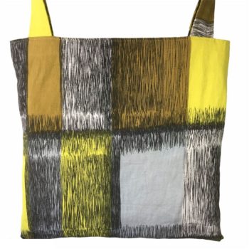 Le motif est présent sur les faces A et B du sac (photos : face A, face B, détails, doublure, poche). Les anses sont réalisées dans les mêmes toiles que le sac.