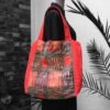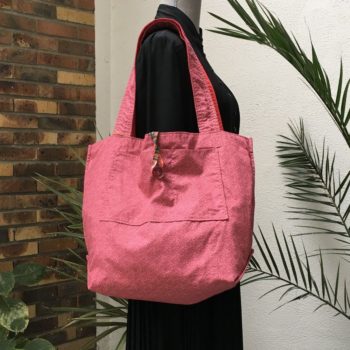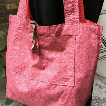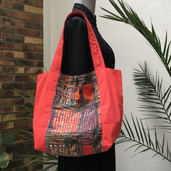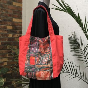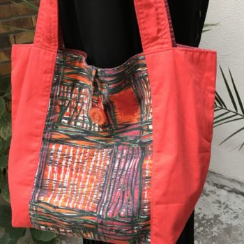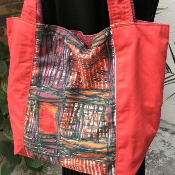 Grand sac cabas XL, doublé réversible. Recto toile d’ameublement, imprimé vintage milieu des 1950s motifs abstraits quadrillage en rouge orange vert rose violet, toile Marignan grand teint meuble. Bordé au recto d’une toile unie rouge.