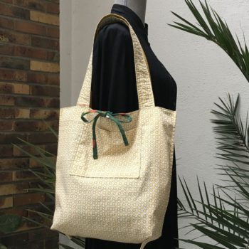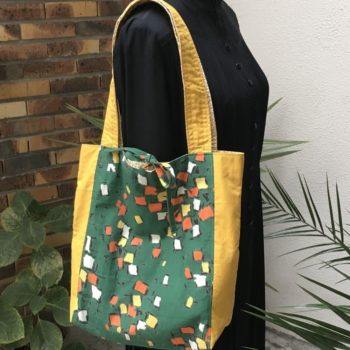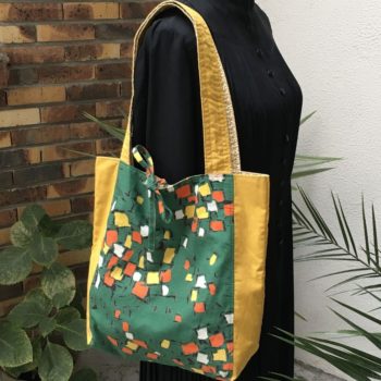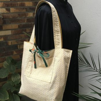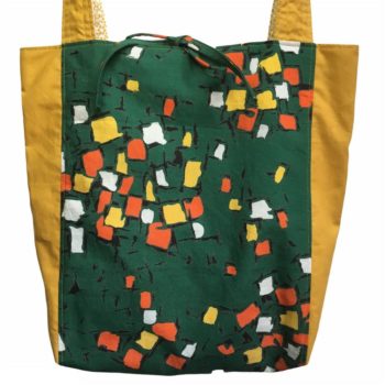 Le motif est présent sur les faces A et B du sac (photos : face A, face B, détails, doublure, poche). Les anses sont réalisées dans les mêmes toiles que le sac.