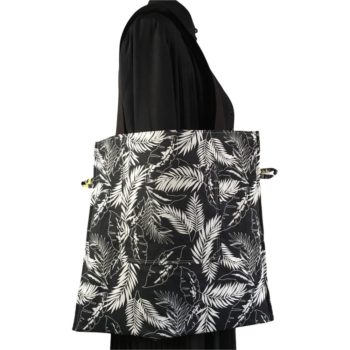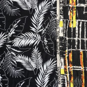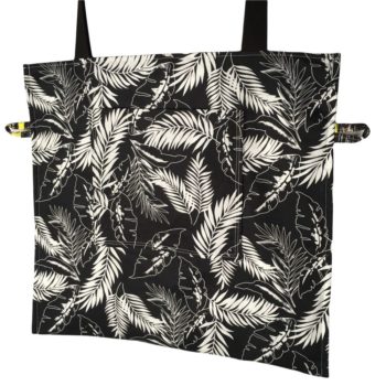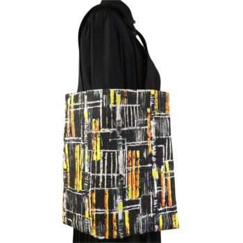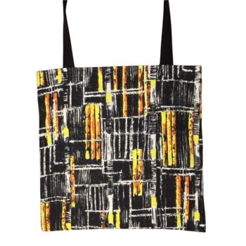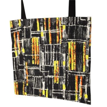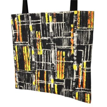 Sac carré plat, doublé réversible. Coupon vintage des années 1950s début 1960s, toile d’ameublement en coton texturé (barkcloth) signée Sogycolor. Les mentions d’origine : Grand teint pigment – Dernière Edition – SOGYCOLOR – Imprimé sur table à la main. Imprimé graphique, motifs géométriques abstraits, formes libres, époque moderne milieu XXe siècle, dessin évoquant un quadrillage à larges traits en orange, jaune et noir sur fond blanc. Doublure 100% coton (popeline) à motifs de feuillage jungle en blanc sur noir.