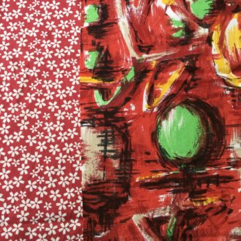 Au recto le tissu vintage arbore un dessin abstrait, des formes libres en jaune, vert, beige, surlignées de noir, sur fond rouge.