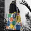 Le motif est présent sur les faces A et B du sac (photos : face A, face B, détails, doublure). Les anses sont réalisées dans les mêmes toiles que le sac.