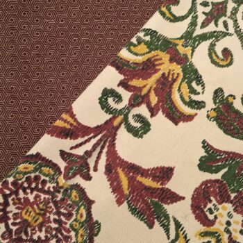 Sur le recto, vous trouverez une toile d’ameublement vintage en coton épais, à effet de fines rainures horizontales de type ottoman. Un imprimé d’ornements baroques, dans le style de damas, aux motifs orientaux damassés en jaune, rouge et vert sur fond beige clair.