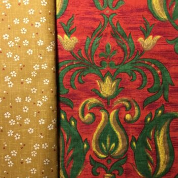 Au recto tissu vintage sans doute 1960s, toile de coton en très bon état avec signature Venezia Grand. Imprimé d’ornements baroques, dans le style de damas, motifs damassés en jaune moutarde et vert sur fond rouge.