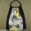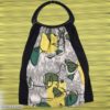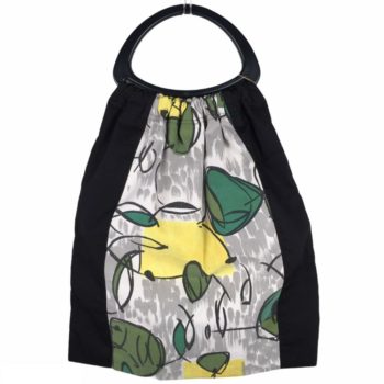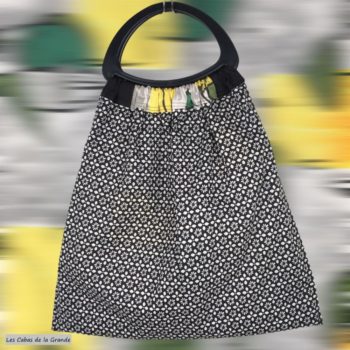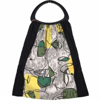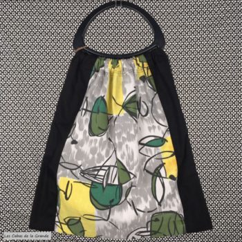 Sac cabas doublé réversible, porté main. Tissu vintage 1950s début 1960s à imprimé géométrique motifs en jaune vert kaki noir sur blanc et gris : modèle Copacabana création Beldecor. Bordé au recto d’une toile unie noire.