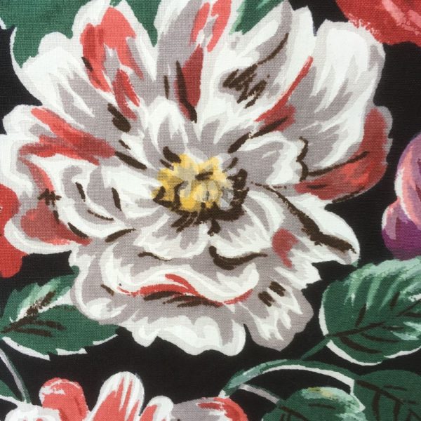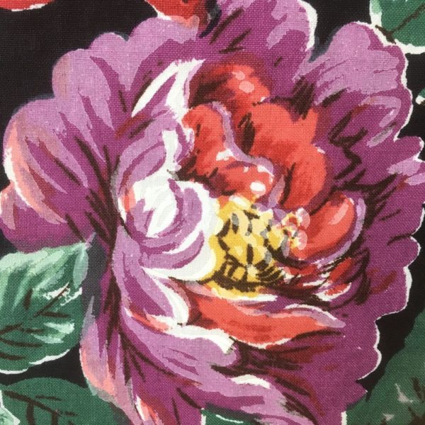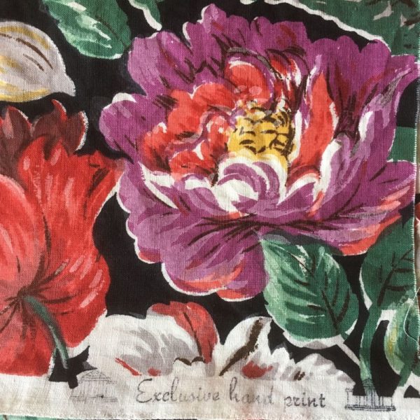 Un magnifique coupon, neuf d’époque, jamais utilisé, chiné aux Puces de Clignancourt, et qui comporte comme seule indication « Exclusive hand print ». Les légères couches de peinture textile se sentent effectivement au toucher.